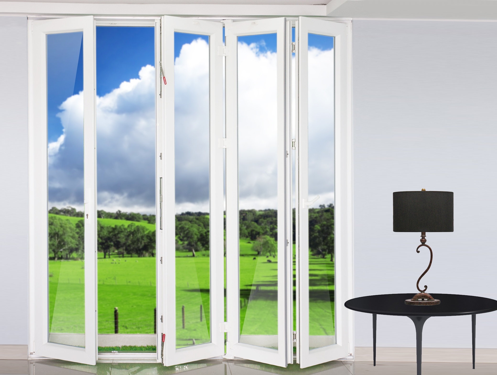 Với thiết kế bề mặt cửa là chất liệu kính nhẵn mịn và sáng bóng, cửa đi mở trượt 4 cánh giống như tấm gương lớn phản chiếu rõ rệt thiên nhiên tươi đẹp và yên bình vào trong ngôi nhà của bạn.