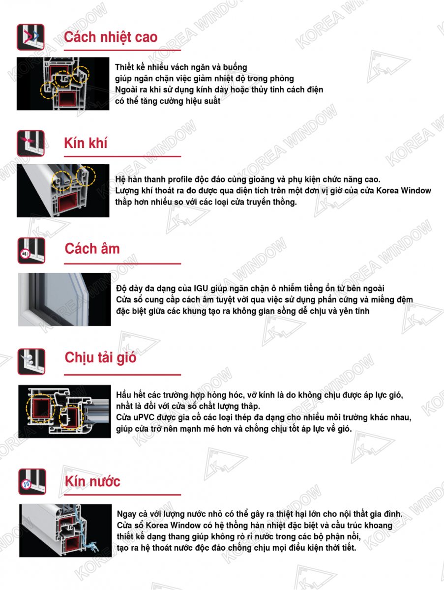 - Hệ thống gioăng kép: được dùng bao quanh khuôn cánh, hệ thống gioăng kép sẽ đảm bảo cho sự kín khít, điều tiết va chạm giữa khuôn cửa và cánh cửa.